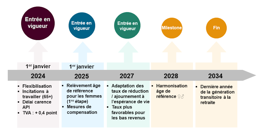L’âge de référence – auparavant appelé « âge de la retraite » – est fixé à 65 ans pour les femmes comme pour les hommes. A cette fin, l’âge de référence des femmes est progressivement relevé de 64 à 65 ans à partir de 2025. Les conditions de départ à la retraite ont été assouplies pour les femmes et les hommes, avec des incitations à travailler plus longtemps.