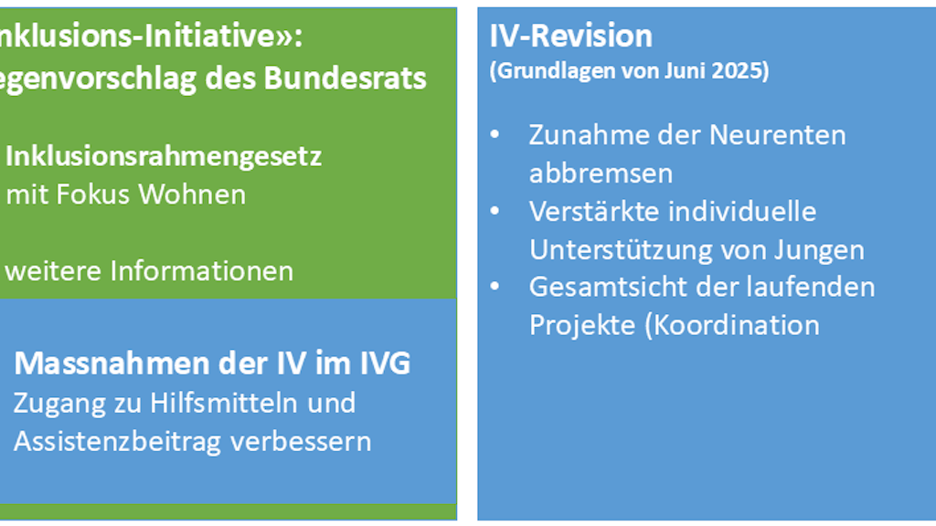 In der Invalidenversicherung (IV) laufen derzeit mehrere Revisionsprojekte. Der Bundesrat hat am 20. Juni 2025 die Grundzüge einer nächsten IV-Revision festgelegt. Zudem sieht auch der Gegenvorschlag zur Volksinitiative «Für die Gleichstellung von Menschen mit Behinderungen (Inklusions-Initiative)» Massnahmen in der IV vor. Diesen hat der Bundesrat am 25.6. verabschiedet.