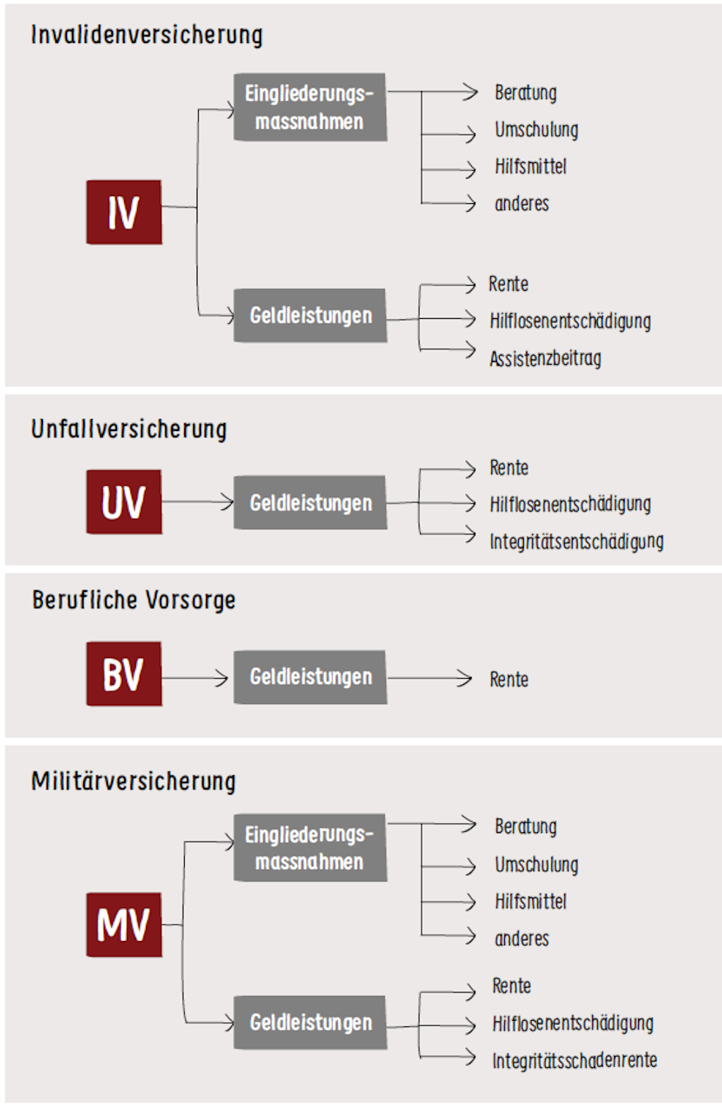 Verschiedene Versicherungen decken das Invaliditätsrisiko ab. Die Anspruchsvoraussetzungen sind je nach Versicherung unterschiedlich.