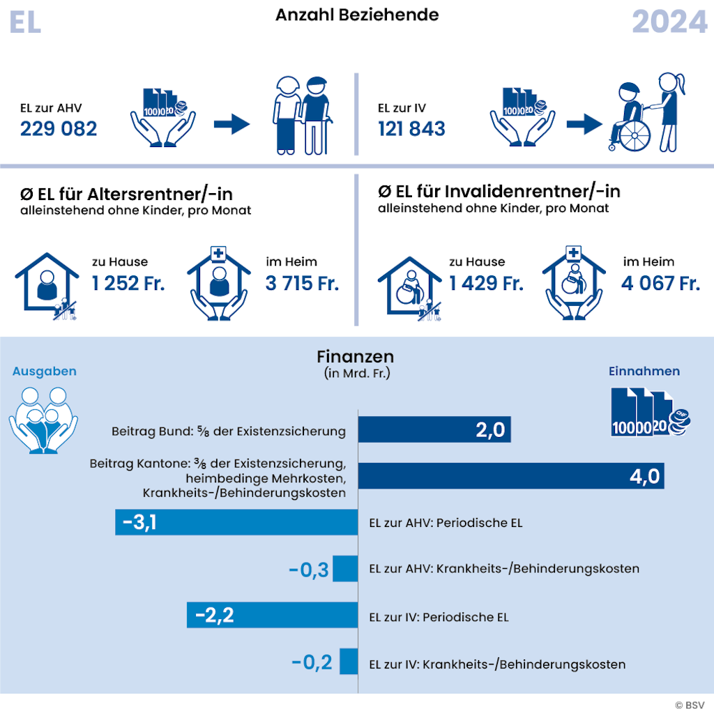 Die Ergänzungsleistungen (EL) sind eine Verbundaufgabe von Bund und Kantonen. Sie werden an Personen mit einer AHV- oder IV-Rente ausgerichtet, wenn diese in der Schweiz wohnen und ihre gesetzlich anerkannten Ausgaben ihre anrechenbaren Einnahmen übersteigen, d.h. ihr Einkommen die minimalen Lebenskosten nicht decken kann. EL sind bedarfsabhängige Versicherungsleistungen, auf die ein rechtlicher Anspruch besteht. Die jährliche EL-Statistik liefert statistisch aufbereitete Informationen über die Anzahl Bezüger/-innen, über die EL-Leistungen und EL-Ausgaben sowie die Berechnungselemente der EL wie Mietzins / Heimtaxen und Vermögen.