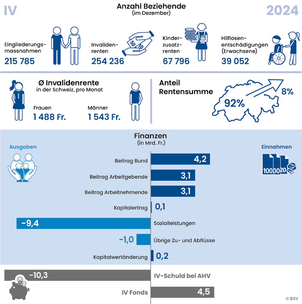 Die IV-Statistik liefert einen jährlichen Überblick über Umfang und Struktur des Leistungsbezugs in den Bereichen Eingliederung, Rente und Hilflosigkeit der Invalidenversicherung. Sie gibt Auskunft über den Ist-Zustand und zeigt Entwicklungen und Trends auf.