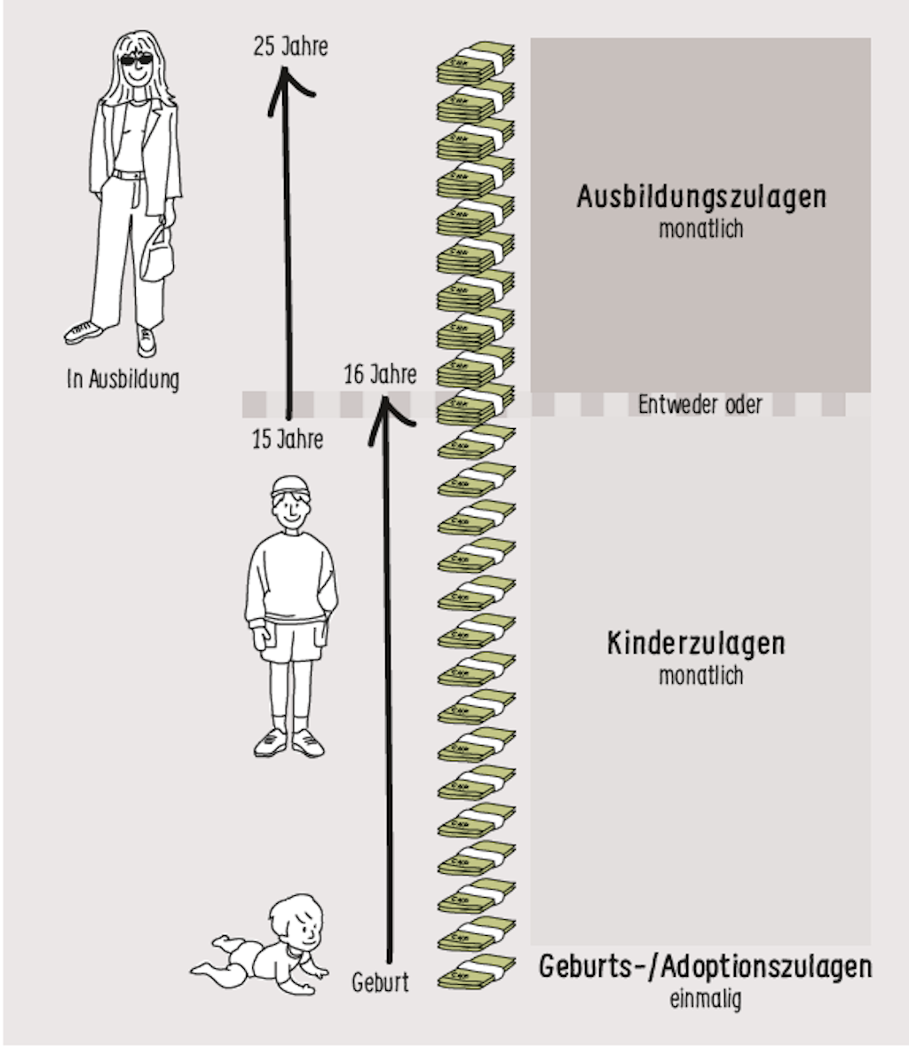 Einige Kantone zahlen zusätzlich Geburts- und Adoptionszulagen.