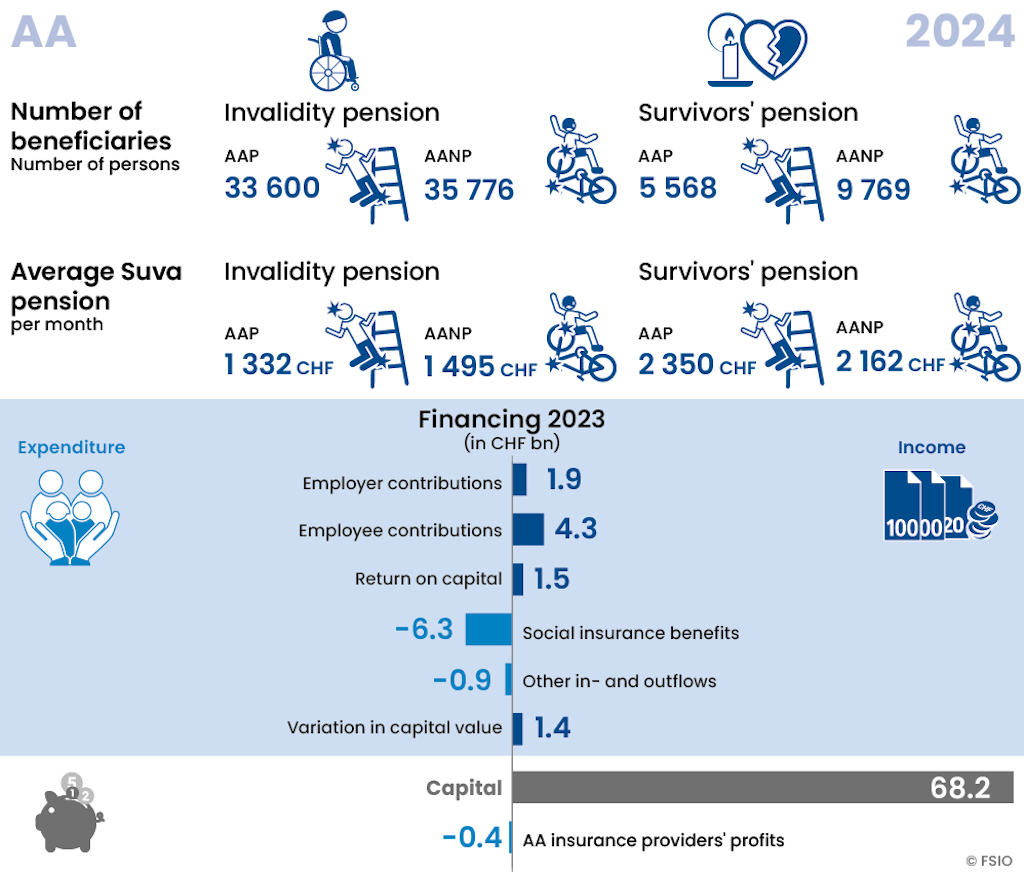 The FSIO does not publish any detailed statistics on this area of insurance. Such statistics are compiled by the Federal Office of Public Health (FOPH), SUVA and the Federal Statistical Office (FSO). Key synoptic tables are included in the FSIO’s Swiss Social Security Statistics.