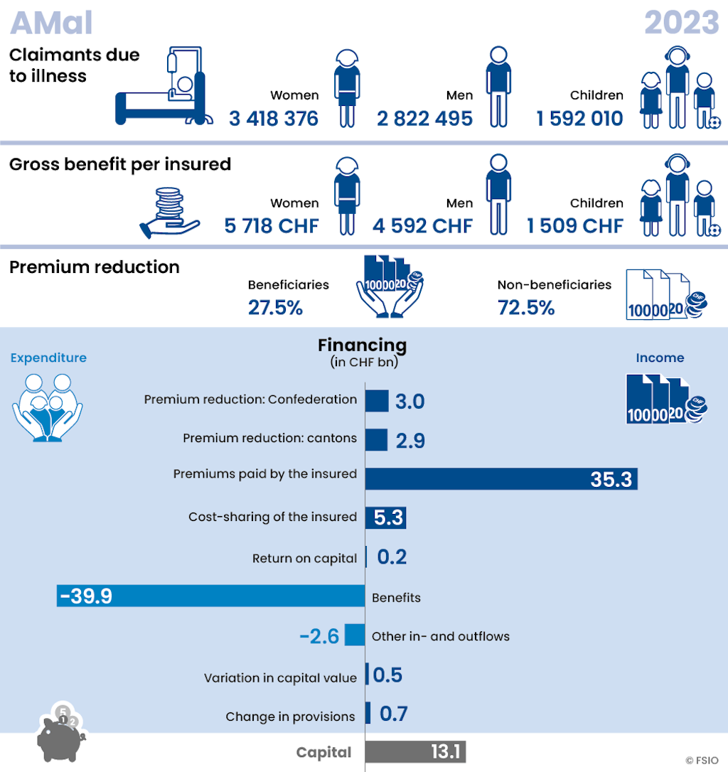 The FSIO does not publish any detailed statistics on this area of insurance. Such statistics are compiled by the Federal Office of Public Health (FOPH), SUVA and the Federal Statistical Office (FSO). Key synoptic tables are included in the FSIO’s Swiss Social Security Statistics.