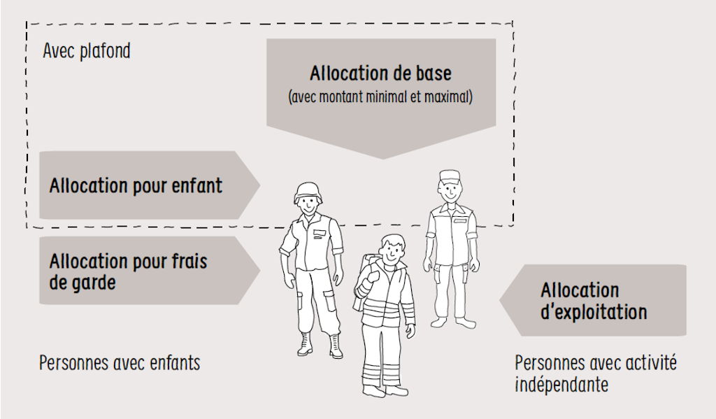 L’allocation pour enfant est réduite si le revenu total (allocation(s) pour enfant + allocation de base) dépasse un certain montant. Un montant minimal est également prévu : APG pour les personnes qui accomplissent un service.