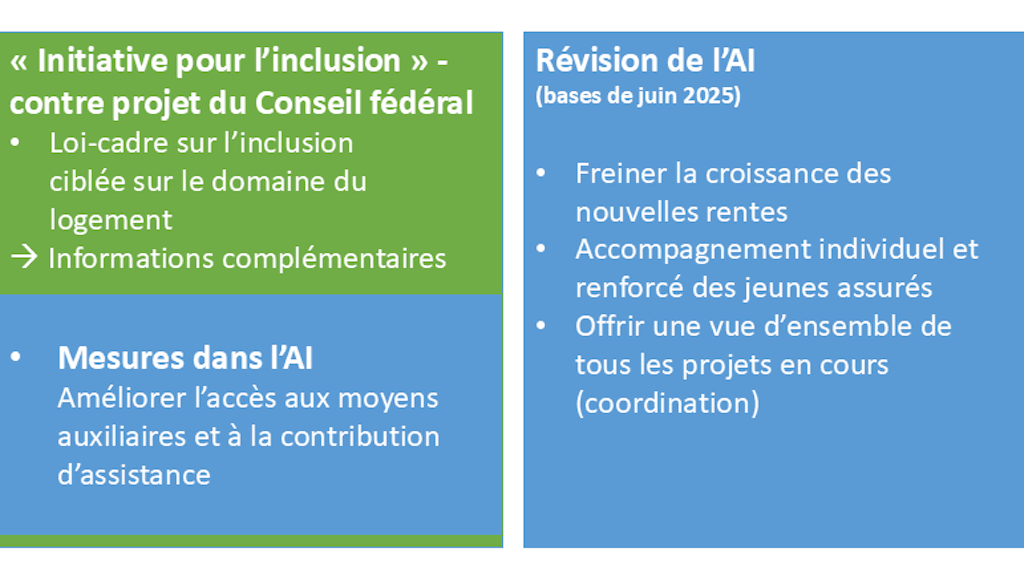 Plusieurs projets de révision sont en cours dans l’assurance-invalidité (AI). Le Conseil fédéral a posé, le 20 juin 2025, les bases de la prochaine révision de l’AI. En parallèle, il prévoit des mesures dans l’AI dans le cadre de son contre-projet à l’initiative populaire « Pour l'égalité des personnes handicapées (initiative pour l'inclusion) », présenté le 25 juin 2025.