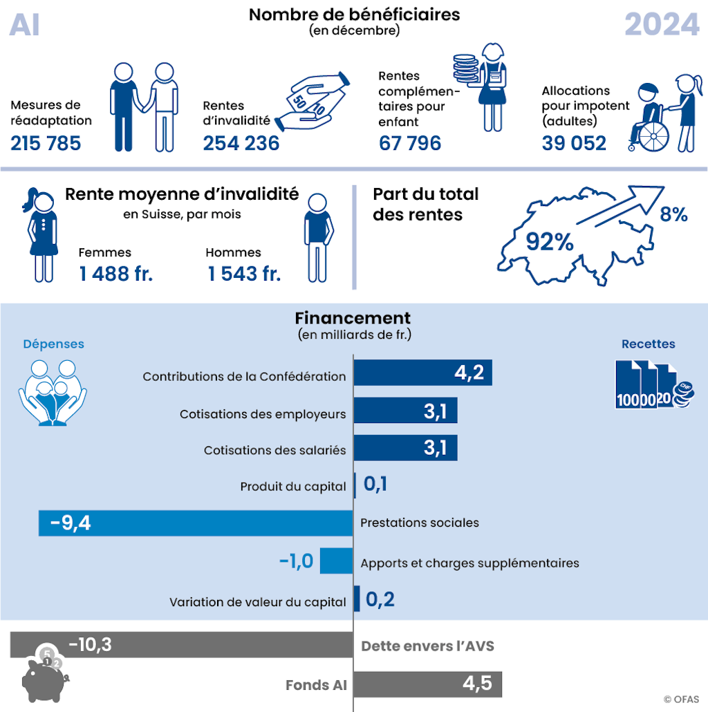 La statistique de l’AI donne une vue d’ensemble annuelle du volume et de la structure des prestations dans les domaines de l’AI que sont la réadaptation, les rentes et l’impotence. Elle fournit des informations sur la situation actuelle, illustre les évolutions et fait apparaître des tendances.