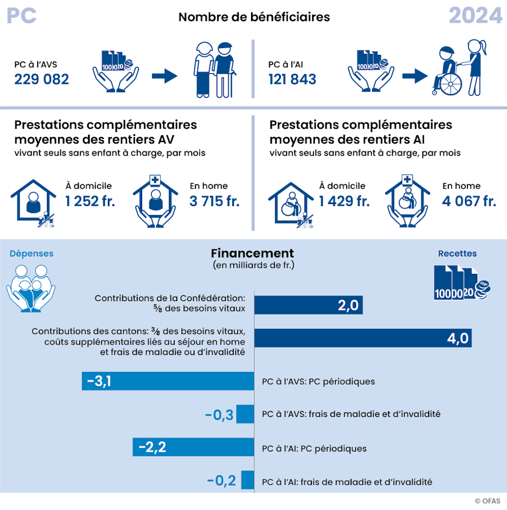 Les prestations complémentaires (PC) constituent une tâche commune de la Confédération et des cantons. Elles sont allouées aux bénéficiaires d’une rente AVS ou AI domiciliés en Suisse dont le revenu ne suffit pas à couvrir les dépenses légalement reconnues, autrement dit ne leur garantit pas le minimum vital. Allouées sous condition de ressources, les PC constituent un droit légal. La statistique annuelle des prestations complémentaires produit des données statistiques sur le nombre de bénéficiaires, les prestations et les dépenses, ainsi que sur les éléments qui servent de base au calcul des PC, tels que le loyer (ou le coût du séjour dans un home) et la fortune.