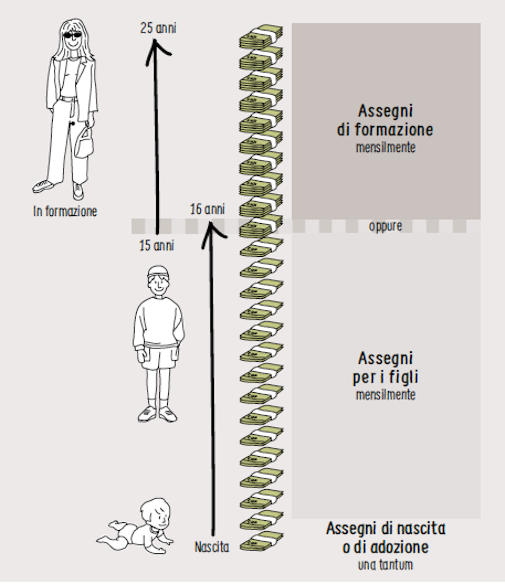 Vi sono due tipi di assegni familiari che vengono versati in tutta la Svizzera: l’assegno per i figli e l’assegno di formazione.