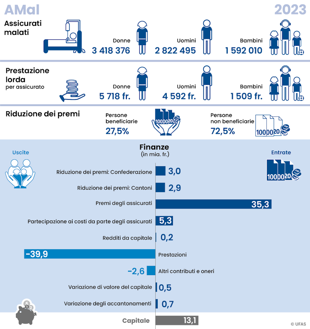 Per questo settore l’UFAS non pubblica statistiche dettagliate, le quali vengono allestite dall’Ufficio federale della sanità pubblica (UFSP), dalla Suva e dall’Ufficio federale di statistica (UST). Le principali tabelle riassuntive figurano nella Schweizerische Sozialversicherungsstatistik (Statistica delle assicurazioni sociali svizzere (d/f) dell’UFAS.