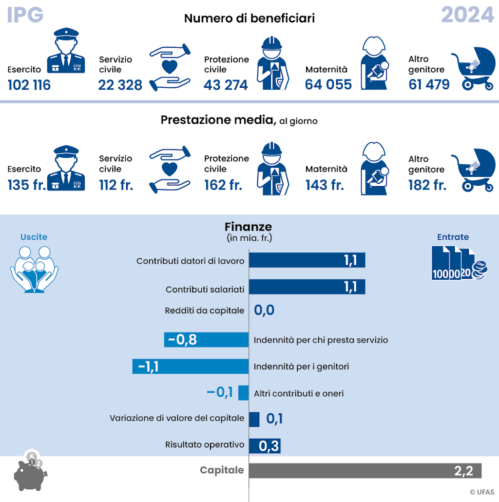La statistica IPG descrive in una prima parte l’evoluzione e la struttura delle prestazioni IPG contabilizzate nell’anno in rassegna secondo il tipo di prestazione. La seconda parte della statistica comprende una presentazione più dettagliata dell’evoluzione del numero di beneficiari di prestazioni e delle prestazioni medie erogate per tipo di servizio specifico o per l’indennità di maternità/paternità. Mostra in particolare l’aumento delle prestazioni dall’introduzione dell’indennità di maternità (2005) e dell’indennità per l’altro genitore (2021) e, d’altro canto, la costante diminuzione del volume delle indennità versate in caso di servizio militare.