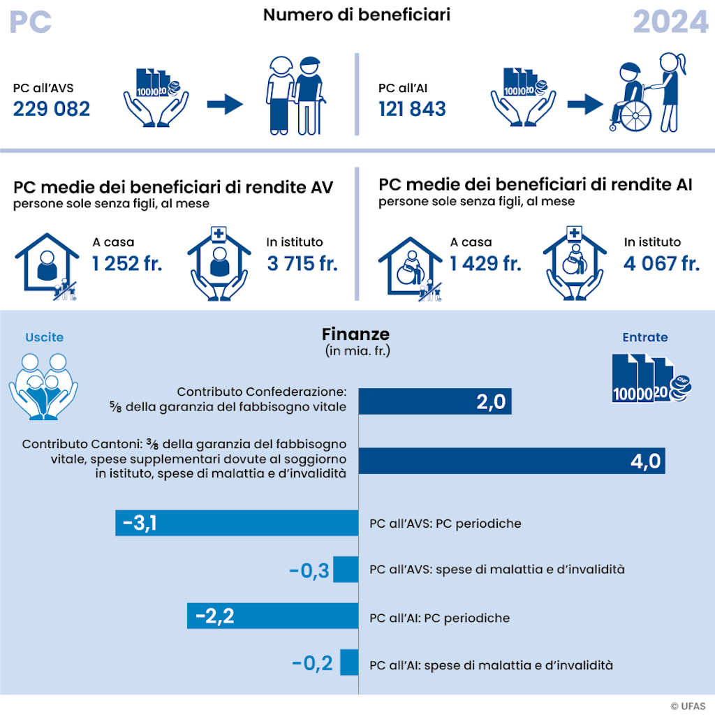 Le prestazioni complementari (PC) sono un compito comune di Confederazione e Cantoni. Sono versate a beneficiari di una rendita AVS o AI domiciliati in Svizzera, le cui spese riconosciute legalmente eccedono i redditi computabili, ossia il cui reddito non riesce a coprire il minimo vitale. Le PC sono prestazioni assicurative legate al bisogno, spettanti di diritto.