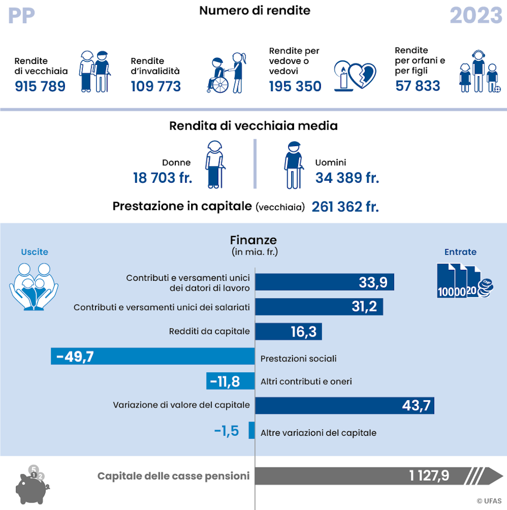 Per questo settore l’UFAS non pubblica statistiche dettagliate, le quali vengono allestite dall’Ufficio federale di statistica (UST), dall’Amministrazione federale delle contribuzioni (AFC) e dalla Banca nazionale svizzera (BNS). Le principali tabelle riassuntive figurano nella Schweizerische Sozialversicherungsstatistik (Statistica delle assicurazioni sociali svizzere [d/f]) dell’UFAS.